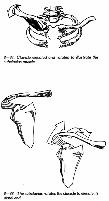 Оттягивает ключицу вниз и вперед, участвует в "причудливом" движении ключицы во время отведения плеча.
