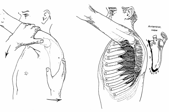 дорсальная поверхность нижнего угла лопатки и нижняя третья часть лопаточно-подмышечной линии.