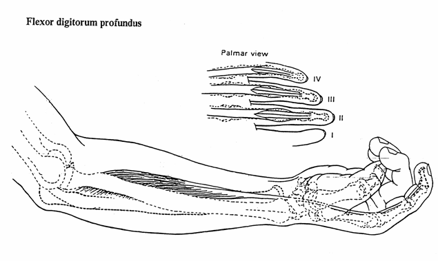 Profundus I и II - Медиальный Profundus III и IV - Локтевой нерв, С7,8, Т1.