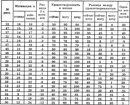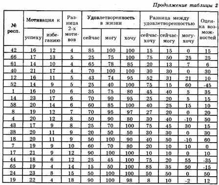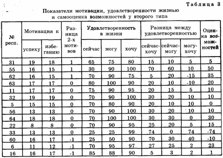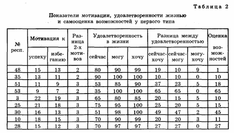 Как видно из таблицы, среди представителей этого типа представлены как люди довольные жизнью, так и недовольные. При этом преобладающая величина устремления к успеху не оказывает прямого влияния на удовлетворенность или неудовлетворенность жизнью и на существующие противоречия (между "хочу" и "могу", между "имею" и "хочу" и т. п.). Однако чем выше желание успеха и субъективная оценка собственных возможностей ("сейчас-могу"), тем ниже степень удовлетворенности. При незначительном же преобладании стремления к успеху желания равны или незначительно превышают возможности. Оценка своих возможностей у испытуемых этого типа может снижаться с ростом стремления к достижению успеха, либо оставаться равной и даже превосходить свои желания. А в общем у представителей этого типа преобладает максимализм, ориентация на полное, абсолютное (на 100%) удовлетворение своих желаний.