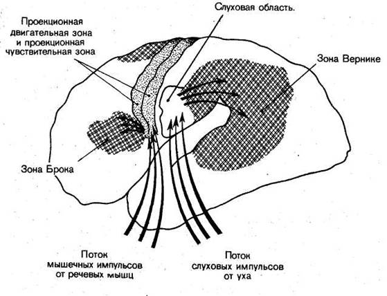 Современная нейропсихология различает речь сенсорную - понимание того, что говорит партнер, и речь моторную, - про 919g66j 80;знесение звуков речи самим человеком. Конечно, обе эти формы речи очень тесно связаны между собой, но все же они различаются по механизмам реализации их основных функций. Важно для нас также и то, что сенсорная и моторная речь управляются разными отделами мозга.