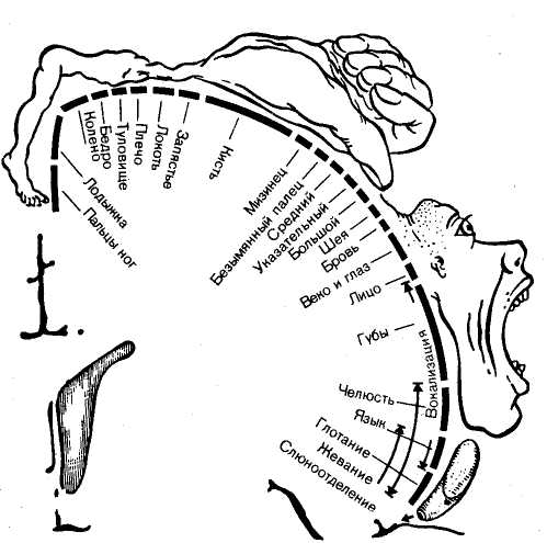 Итак, три разных способа передачи, а результат один - сообщение принято понято и реализовано. Разобранные примеры - прямая аналогия с чтением. Различие лишь в том, что при чтении мы только принимаем сообщения, и от нас в принципе зависит, каким способом (в каком коде) этот прием реализовывать: зрительном/слуховом или двигательном. Вместе с тем из всего этого можно сделать такой вывод: если движения рукой позволяют реализовать речевые коммуникативные действия, то, очевидно, такие движения безусловно возбуждают и определенные отделы коры головного мозга, посылая туда соответствующие импульсы. О том, что рука действительно играет большую роль в организации различных функции мозга можно судить по рис. 12. Здесь показан условный человечек, так называемый гомункулус. Размеры различных частей его тела соответствуют той части коры головного мозга, которая связана с анализом тех или иных ощущений, поступающих в мозг от различных частей тела. Обратите внимание, какая большая часть коры головного мозга вовлекается в активную деятельность каждый раз, когда кисть руки выполняет определенные действия, например выстукивает ритм. . При выстукивании рукой ритма речедвигательный канал восприятия оказывается занят этой работой и про 919g66j 81;ти по нему встречным нервным импульсам уже нельзя. Теперь представьте себе, что, про 919g66j 76;олжая движения рукой (выстукивая ритм) и порождая при этом помеху в речедвигательном канале, вы начинаете читать про себя текст. Зону Брока охватывает отрицательная индукция из-за помехи, и канал для про 919g66j 93;ождения управляющих импульсов на артикуляцию закрыт. В этом варианте читать можно только в том случае, если ваше чтение не сопро 919g66j 74;ождается звучной артикуляцией. Как только про 919g66j 80;зносится вслух читаемое слово, сразу же ритм сбивается. И наоборот, пока выстукивается ритм, про 919g66j 75;оваривать читаемое невозможно: зона Брока заперта, речедвигательный канал закрыт.