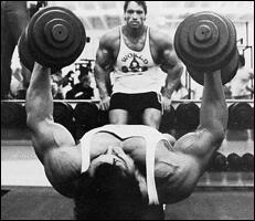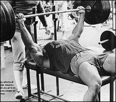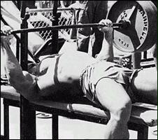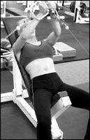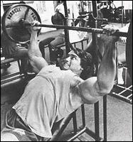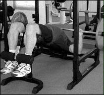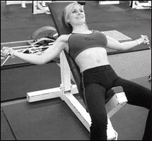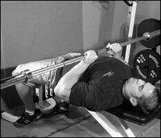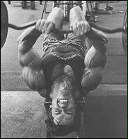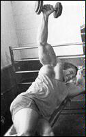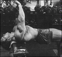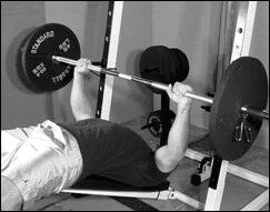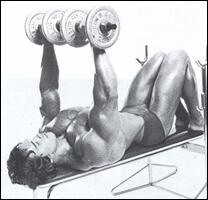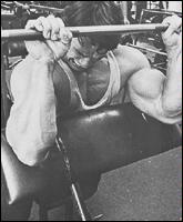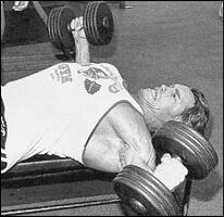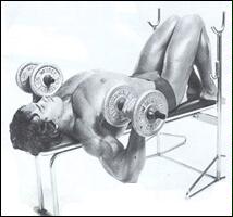 Лягте на наклонную скамью головой вниз. Снимите штангу со стоек и поднимите ее строго вверх. В вытянутых руках гриф должен находиться на уровне плечевых суставов. Медленно опустите штангу в середину груди. После касания груди, начинайте выполнять обратное движение. Во избежании "отвислости" грудных мышц не рекомендуется злоупотреблять этим упраженением.