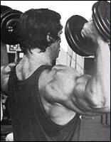 Возьмите в руки гантели, поставьте ноги на ширину плеч. Слегка наклонитесь вперед, немного согните руки в локтях и поднимите гантели по широкой дуге вверх и немного вперед на уровень чуть выше плеч. Ладони при этом должны быть направлены вниз. В верхней точке мизинцы должны быть выше больших пальцев. Задержитесь в этом положении на 1-2 секунды и медленно, сохраняя контроль над весом, опустите руки в исходное положение. В этом упражнении нельзя допускать раскачивания тела вперед и назад, а также раскачивать гантели. т.к. это значительно снижает эффективность упражнения. Чтобы избежать "читинга", упражнение выполняют сидя.