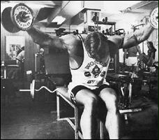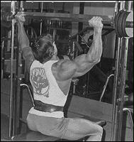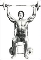 В положении сидя, захватите гриф штанги на расстоянии немного большем ширины плеч и поднимите на грудь. Из этого положения выжмите снаряд вертикально вверх, стараясь не допускать "читинга". Опустите штангу в исходное положение и выполните следующее повторение.