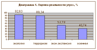 . Был задан вопрос «Как Вы думаете, существуют ли реаль 17317x2324r 085;о для России следующие угрозы?». Оценивались внешняя военная угроза, терроризм, экологическая и угроза экономической экспансии.