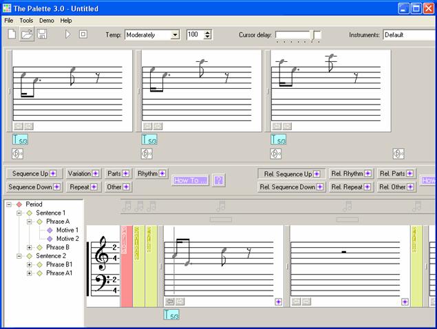 В программе Palette имеются средства для реализации всех перечисленных способов превращения мотива в музыкальную фразу. В свою очередь, на основе фраз могут быть сформированы предложения, а на их основе - периоды.
