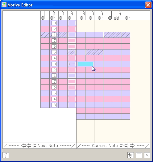 Окно редактора мотива разделено на две половины: левую и правую. Активная половина редактора имеет бежевый фон. Каждая из половин предлагает на выбор ноты. Если выбрать один из вариантов в активной половине редактора, то выбранная нота будет вставлена в текущее время мотива, к которому на данный момент "прикреплен" редактор мотива. Текущие ноты мотива показаны заштрихованными прямоугольниками. Ноты, которые вы выбираете, придумывая и редактируя мотив, в окне редактора отображаются как разноцветные прямоугольники. Красным цветом показаны неаккордовые ноты, синим - аккордовые. Если в редактируемом мотиве в текущем времени нет аккорда, тогда все варианты отображаются синим цветом. Кроме того, в такой ситуации, программа не просчитывает высоту тона ноты, а позволяет выбрать любую высоту. Выбранная нота отображается прямоугольником, цвет которого зависит от того, какой ступенью лада она является.