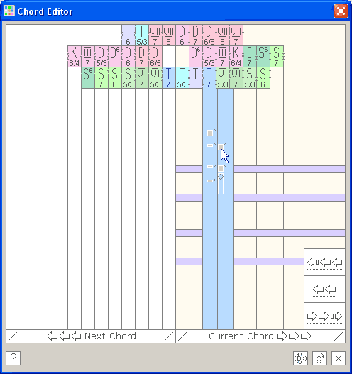 Устройство окна редактора аккордов аналогично устройству окна редактора мотива: тоже имеется две половины, и время в левой половине тоже "идет вспять". Суть работы в этом окне сводится к выбору очередного аккорда из нескольких вариантов, вычисленных и предложенных программой с учетом характера развития предшествующей части аккордовой последовательности и законов гармонии. Кроме типа аккорда здесь можно также выбрать его расположение.