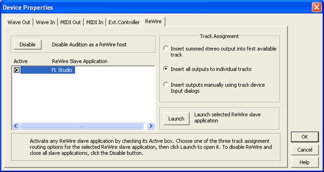 Как же установить связь приложения ReWire с Adobe Audition? Первым делом нужно переключить Adobe Audition в режим (Multitrack View), затем в главном меню выбрать команду Options > Device Properties, а в открывшемся одноименном окне перейти на вкладку ReWire. Там следует нажать кнопку Enable (после чего она сменит свое название на Disable).