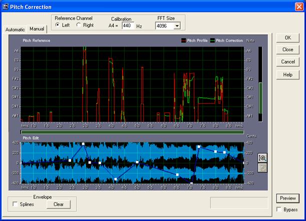 Окно эффекта состоит из двух вкладок. На одной (Automatic - соответствует автоматическому режиму коррекции, на рисунке не показана) вы должны выбрать параметры распознавания и коррекции тона. На другой (Manual) - находятся специальные дисплеи. Верхний дисплей предназначен для отображения графиков реального (красные линии) и скорректированного (зеленые линии) изменений высоты тона. Вертикальная ось системы координат соответствует высоте тона, горизонтальными линиями сетки обозначены тона гаммы. По горизонтальной оси отложено время.