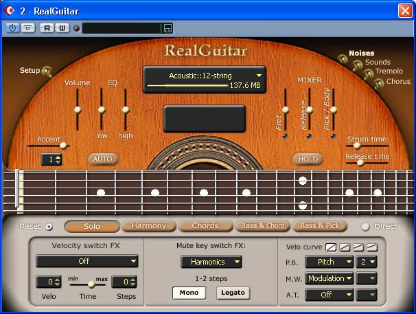 Для работы с VST-инструментом RealGuitar рекомендуется иметь достаточно производительный компьютер: процессор 2GHz P4, объем RAM 1 Гб. Такие относительно высокие требования неслучайны. Память большого объема требуется по той причине, что в нее необходимо загружать все , соответствующие выбранному типу гитары, а это составляет более 100 Мб. Кроме того, следует учесть потребности операционной системы, приплюсовать сюда память, необходимую для работы программы-хоста, а также других виртуальных инструментов, используемых в проекте. Процессор нагружен работой внутреннего - воспроизведением и обработкой их фильтрами, модуляторами, формирователями огибающих ADSR, и т. п. Звучание каждой ноты формируется за счет одновременной работы многих осцилляторов. Ведь кроме собственно звука струны, прижатой к определенному ладу, воспроизводятся также и различные призвуки, необходимые для реалистичного моделирования игры на гитаре: призвук медиатора, призвук, сопровождающий отпускание прижатой струны и т. п. Поэтому, например, в звучании аккорда одновременно используются до 18 осцилляторов. Заметим, что информацию о типовой структуре , а также входящих в его состав элементов, таких как осцилляторы, формирователи огибающих ADSR, фильтры и модуляторы, можно найти в книге "Музыкальный компьютер. Секреты мастерства".