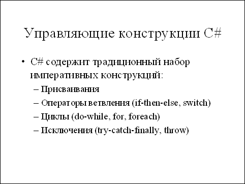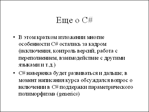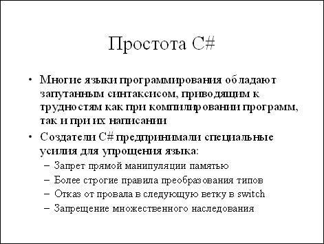 C# занимает некоторую промежуточную позицию: из стандарта языка убраны наиболее неприятные и неоднозначные особенности С++, но в то же время язык сохранил мощные выразительные возможности, присущие для таких языков, как С++, Java или VB