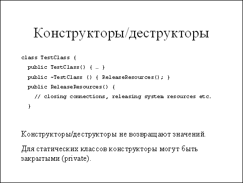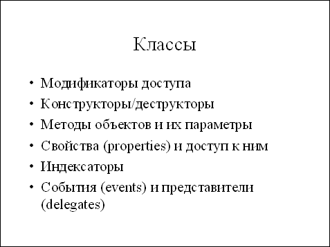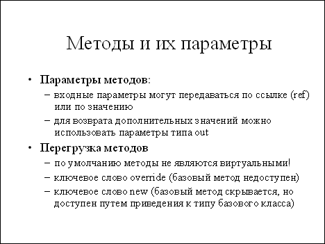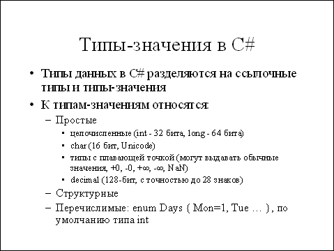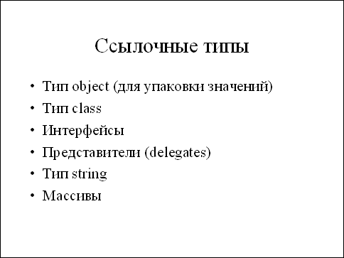 Все ссылочные типы произведены от базового типа object, являющегося точным эквивалентом класса System.Object. Сам по себе тип object в основном используется для упаковки значений, подробно обсуждавшейся выше. Другая, более важная роль типа object заключается в том, что он является корнем для всей иерархии объектов в .NET и по умолчанию все классы унаследованы именно от System.Object. Классы могут иметь свои поля, методы, реализовывать интерфейсы и т.п. Так как классы представляют собой основной механизм организации программ и данных в C#, мы уделим им особое внимание в последующих слайдах.