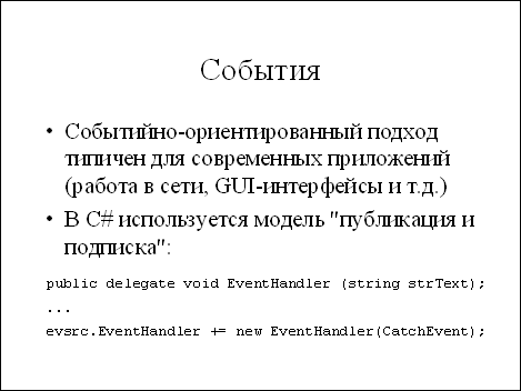 GUI C# используется модель "публикация/подписка" - класс публикует те события, которые он может инициировать, а другие классы могут подписаться на получение извещений о них. Для реализации этой модели используются представители (delegates C# роль "безопасных указателей на функцию".