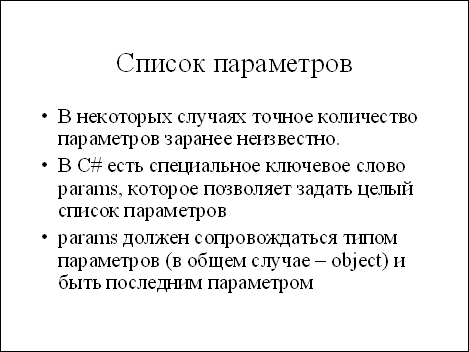 Console WriteLine может принимать как одиночные переменные известного типа, так и произвольное число объектов для печати. В С++ для этого используется аргумент "многоточие"; в C params object