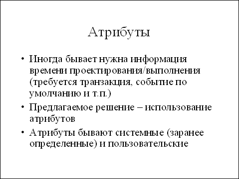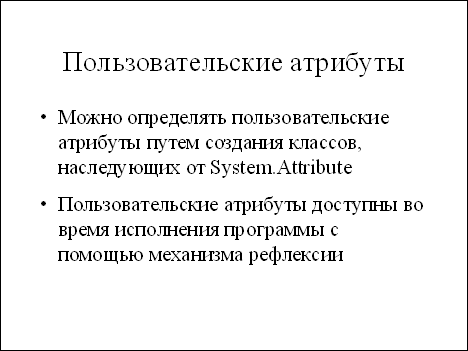 Естественно, что программист может определять и собственные, пользовательские атриб 919y2417j уты. Для этого достаточно создать класс, унаследованный от System Attribute. В следующем примере мы покажем создание и использование атриб 919y2417j ута, задающего гиперссылку на страничку с информацией о классе и его методах: