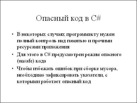 C unsafe unsafe. Внутри опасных блоков можно применять операторы * и &, указатели, адресную арифметику и т.д., но, естественно, сгенерированная таким образом программа не будет гарантированно безопасной.