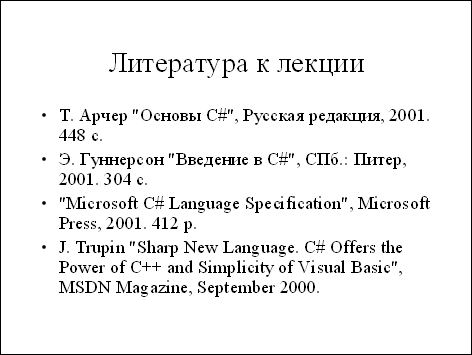 Э. Гуннерсон "Введение в C#", СПб.: Питер, 2001. 304 с.