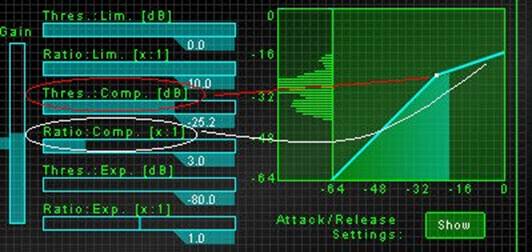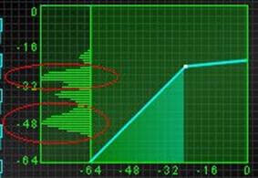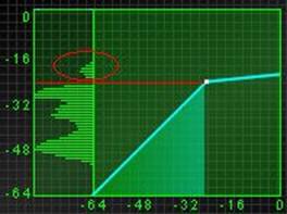 histogram - слева . Считайте его измерителем уровня сигнала с памятью. В процессе изменения уровня сигнала, histogram показывает историю того, где какие значения уровня были, показывая это более широким линиям. На рисунке, мы видим, что высок уровень на -48 dB и много его от-20 до-32 dB. Область, выделенная красным овалом это - наша цель в компрессии.