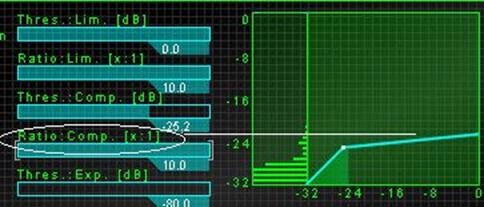 . Удобство и польза комбинации компрессора/ /экспандер- то, что Вы можете использовать компрессор, чтобы мягко сжать средний или уровень . Ограничитель заботится о пиках с высоким уровнем сигнала, Вы можете добавлять плотность Вашему применяя небольшие значения ratio на компрессоре (от 1.1 до 2.0). И поместите порог для компрессора ниже к краю среднего уровня (приблизительно от -30 до-50, в зависимости от звуковой ситуации)
