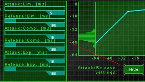 Разберем два параметра, связанные с нашим простым компрессором. Это Attack Release. Вы можете регулировать их, щелкая на кнопке "Attack/Release Show". На экране появляется группа средств управления этими значениями.