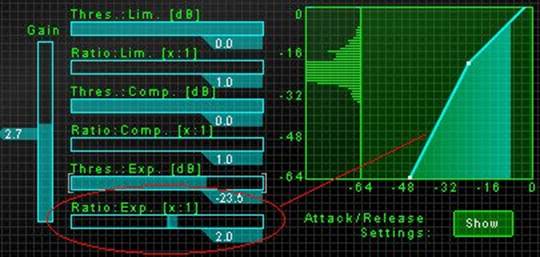Секция Модуля динамического расширения (Expander) работает в самом низу, по уровню сигнала - его сигналы НИЖЕ его порога (в противоположность компрессору и , которые работают на сигналах выше их порогов)