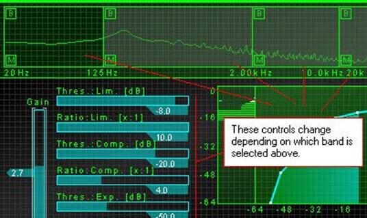 При использовании Multiband Dynamics щелкните на картинке диапазона и программа отобразит набор средства управления динамикой, которое является соответствующим данной полосе.