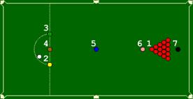 если биток касается 2-х или более бортов, затем прицельного шара, затем одного или более бортов и попадает в другой прицельный шар.