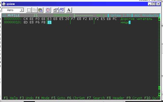 QVIEW. Запустите его и перейдите в режим открытия файла <ALT F6>, выберете «Новый файл» нажатием клавиши <F4> и назовите его, например, «letter txt». Затем, разрешите редактирование его содержимого нажатием клавиши <F3>. До начала расшифровки необходимо выбрать соответствующую кодировку (выбор кодировки в QVIEW осуществляется нажатием клавиши <F6>). Вид кодировки, используемой при написании письма, содержится в его заголовке windows