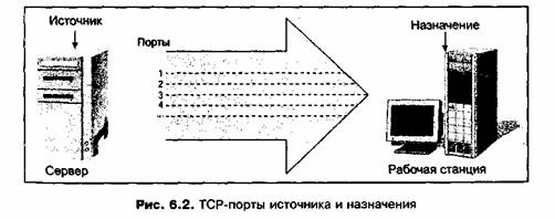 Source Port) - некото 414e49e рый порт TCP (называемый также сокетом или сеансом в других прото 414e49e колах), подобный виртуальному каналу между двумя коммуникационными процессами на разных узлах (рис. 6.2). Для обеспечения совместимости некото 414e49e рым портам TCP (также называемым "хорошо известными портами") назначаются определенные задачи. Назначение портов TCP и их описание можно найти в RFC 1700. Наличие механизма портов TCP означает, что в определенный момент времени в течение одного сеанса связи между двумя взаимодействующими узлами может выполняться обмен данными между несколькими процессами. Например, по одному порту может передаваться; состояние сети, а по другому - сообщения электронной почты или файлы. Порт источника - это порт TCP на передающем устройстве. Некото 414e49e рые обычно используемые порты TCP перечислены в табл. 6.1.