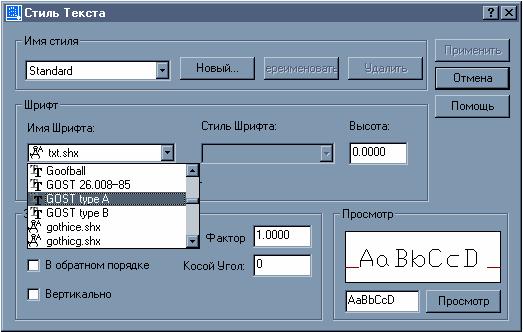 Standard. Из имен шрифтов выбираем с помощью прокрутки Gost type A.shx. В окне Угол наклона набираем с клавиатуры величину угла 15 от нормали к основанию текста по часовой стрелке. В окне Высота устанавливаем высоту шрифта 0. Это значит, что при написании какого-либо текста система будет запрашивать требуемую высоту текста. Назначаем степень растяжения знаков 0,8. Завершаем выбор нажатием на кнопку Применить или Закрыть.