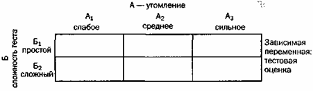 Такой план, к-рый обычно называют факторным планом 3x2 (поскольку первый фактор имеет три уровня, а второй - два), позволяет изучить эффекты утомления и сложности теста по отдельности и к тому же их совместные или комбинированные эффекты. В плане 3x2 имеется 6 (три на две) групп, по одной на каждую комбинацию уровней. Каждая группа представлена одной ячейкой плана на рис. 2. Напр., одна группа в состоянии слабого утомления будет работать с легким тестом; др. группа будет работать с тем же легким тестом, находясь в состоянии сильного утомления, и т. д.