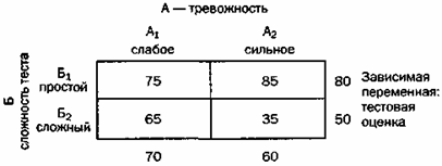 Взаимодействия и главные эффекты логически независимы. Рассмотрим в качестве примера несколько отличающийся от предыдущего двухфакторный план, изображенный на рис. 6, где фактор А - тревожность испытуемого (с двумя уровнями - высокая и низкая), а фактор Б - сложность теста (также с двумя уровнями - простой и сложный тест).