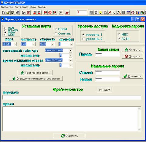 Окно «Параметры соединения» предназначено для установки параметров связи (как со стороны компьютера, так и со стороны счетчика), выбора уровня доступа и введения соответствующего пароля, изменения паролей и обмена со счетчиком в режиме командной строки («Фрэйм-монитор»).