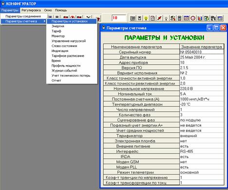 выбрать пункт меню «Параметры и установки». При этом на экране монитора появится окно «Параметры и установки» с таблицей, в которой, в случае успешного обмена, будут представлены все параметры и установки счётчика, к которому происходит обращение (рис.10).