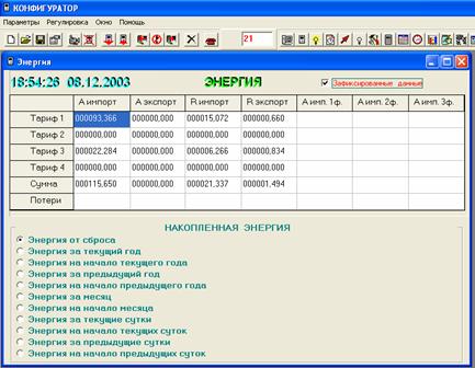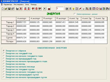 Для считывания зафиксированных энергетических показаний со счётчика необходимо выполнить следующие операции в окне «Энергия»:
