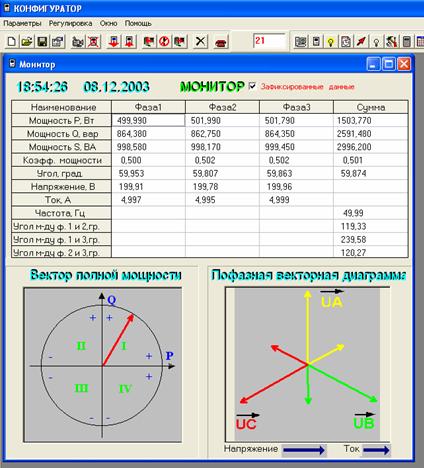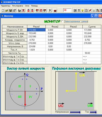 выбрать пункт меню «Монитор». При этом на экране монитора ПК появится окно «Монитор» (рис.15), в котором, в случае успешного обмена, будут отображены вспомогательные параметры и векторная диаграмма трехфазной сети (вектора полной мощности, тока и напряжения);