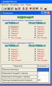 При этом на экране монитора появится окно «Индикация » (рис.19), в котором содержится перечень индицируемых показаний потреблённой энергии (по сумме тарифов, тариф 1, тариф 2, тариф 3, тариф 4, потери) раздельно для активной и реактивной энергии при автоматическом режиме смены параметров, перечень индицируемых показаний потреблённой энергии (по сумме тарифов, тариф 1, тариф 2, тариф 3, тариф 4, потери) раздельно для активной и реактивной энергии при ручном режиме смены параметров и, кроме того, выводится таблица, в которой отображены значения параметров режимов индикации.