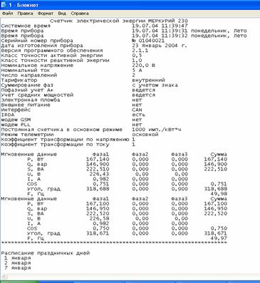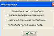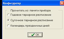 в «Строке сообщений», в случае успешного обмена, появится «Успешное завершение обмена», а на экране монитора появится считанное тарифное расписание или расписание праздничных дней, из прибора, к которому происходит обращение. При этом массивы данных памяти компьютера заместятся данными, считанными со счетчика.