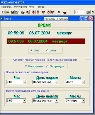 в случае успешного обмена, на экране монитора, в окне «Время» отобразятся текущее время компьютера и счетчика и параметры перевода сезонного времени, прочитанные из счетчика. (Рис.24);