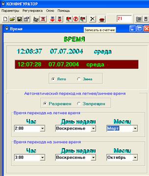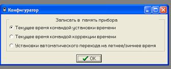 выбрать пункт меню «Время». При этом на экране монитора появится окно «Время», где отображено две строки, содержащие значения времени. Верхняя строка времени - время компьютера. Нижняя строка - время прибора. Кроме того, в окне индицируются параметры сезонного перевода времени;
