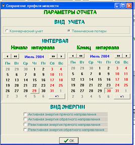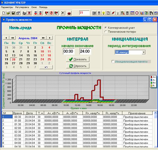 при правильной установке вида учета и запрашиваемой даты, на экране появляется окно «Профиль мощности», в котором отражен суточный профиль мощности и соответствующая таблица значений. В противном случае появляются записи «Файл несуществующего формата» и «Данные за запрашиваемые сутки не найдены».;