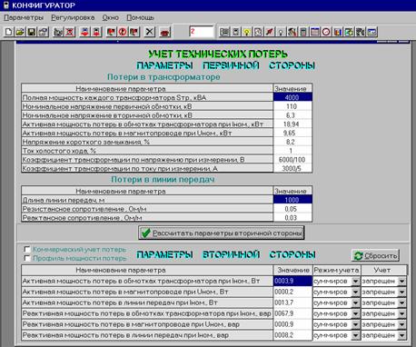 выбрать пункт меню «Учет технических потерь». При этом на экране монитора появится окно «Учет технических потерь » (рис.34), в котором отображены таблицы параметров первичной стороны (потери в трансформаторе, в линии передач, их значения) и параметры вторичной стороны (наименование параметра, значение, режим учета);