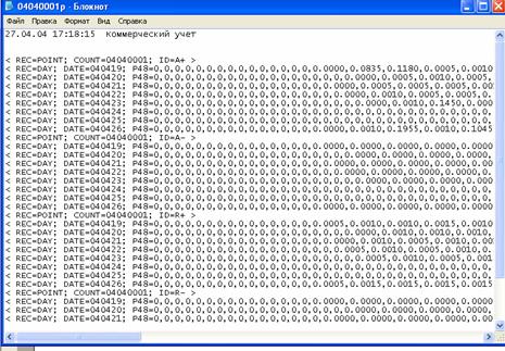 Верхняя строка файла содержит дату (число, месяц, год), время (час, минуты, секунды) и вид учета. Далее идут записи, содержащие информацию о значениях средних мощностей на требуемых периодах интегрирования за сутки.
