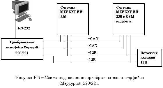 CAN интерфейс локального компьютера в соответствии со схемой подключения В.3 ("плюс" питания преобразователя интерфейса Меркурий 220/221 НЕ ПОДКЛЮЧАТЬ);