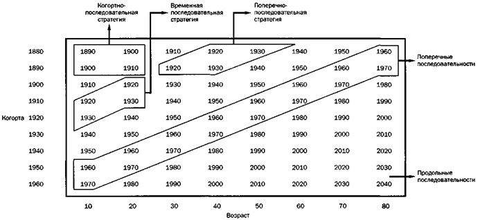 Касаясь минимального набора планов, представленных на рис. 1, Шайи предполагает, что когортно-последовательная стратегия (cohort-sequential strategy) позволит отделить возрастные изменения от когортных различий при условии незначительных эффектов времени измерения. Временная последовательная стратегия (time-sequential strategy) позволит отделить возрастные различия от различий, связанных с периодом измерения, при условии лишь незначительных эффектов когорты. Наконец, поперечно-последовательная стратегия (cross-sequential strategy) позволит отделить когортные различия от различий, связанных с периодом измерения. Временная последовательная стратегия, разумеется, исключает возможность повторных измерений (т. е. один и тот же индивидуум не может иметь один и тот же возраст в двух различных временных точках), однако ее преимущество состоит в оценке возрастных различий для целей соц. политики, причем по тем зависимым переменным, для к-рых эффекты когорты, по-видимому, оказываются минимальными. Это тж подходящая стратегия для оценки эффектов времени измерения (периода) в исслед., охватывающих широкий диапазон возрастов/ когорт.