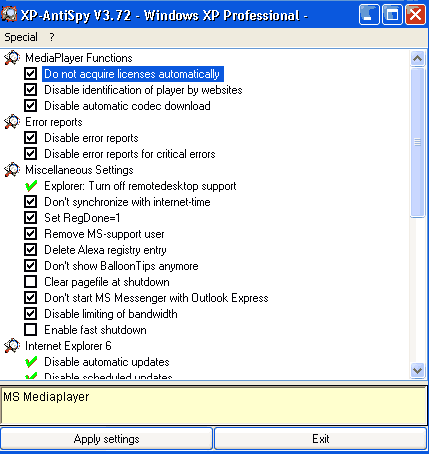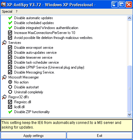 Postoji mogućnost da neke stavke ni na koji način neće da prihvate promenu opcije. Ukoliko se desi ovaj slučaj, pokusajte ponovo posle podesavanja Windows XP Services koja se nalaze u istoimenoj sekciji na ovom sajtu.