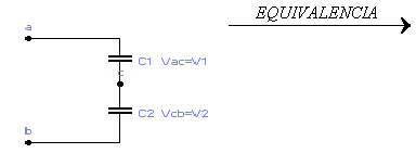La Capacidad equivalente C de una combinación en serie se define como la de un solo condensador de carga Q igual a la de la combinación, cuando la diferencia de potencial V es igual.