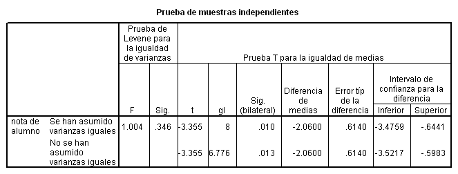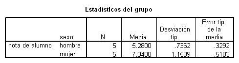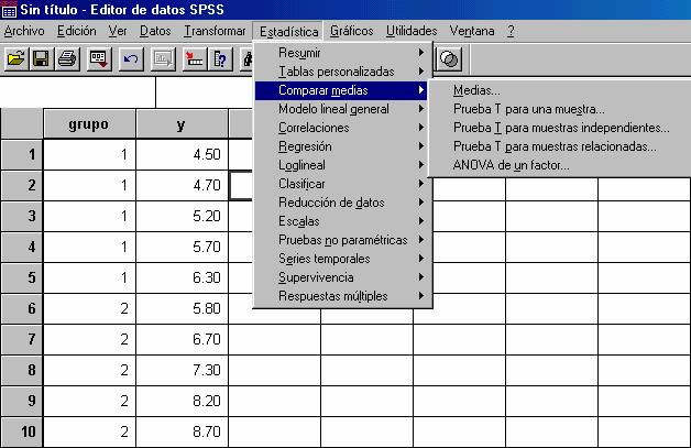 En otras palabras SPSS necesita un indicador de como hay que agrupar cada caso (en nuestro ejemplo esto es realizado por la variable llamada GRUPO), así como también el valor de la variable medida (en el ejemplo Y). Una vez que los datos son introducidos de acuerdo a este formato, cualquier de los procedimientos siguientes pueden usarse para obtener una prueba de la hipótesis nula sobre la igualdad de los dos grupos en la población:
